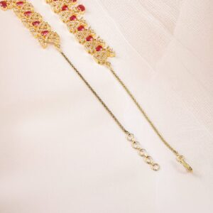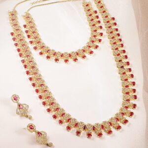 Jewellery Set : This luxurious set of 2 necklaces is meticulously crafted with a 22K gold-plated finish, featuring brilliant ruby red stones and sparkling cubic zirconia. The first necklace is a longer design, ideal for layering or wearing as a statement piece. The second necklace, sits perfectly on the neckline for a more subtle yet elegant look. Paired with matching earrings, this set offers versatility and timeless beauty, making it a must-have for any festive or traditional collection. Occasion : Bring your style to a whole new level with this handcrafted piece of jewellery. When you’re celebrating a special Occasion : – a birthday, wedding, or personal milestone – this piece adds that extra something that makes us feel special and looking our best. Material : & Care Dimension : Length : 52 cm / 2 cm, Width: 4.5 cm / 2 cm Net Quantity : 1 Necklace & 2 Earrings Net Weight: 145.94 g Material :Brass Care Label : It is advisable to avoid contact with water and organic chemicals i.e. perfume sprays. Store jewellery in airtight box. After use, wipe the jewellery with soft cotton cloth.