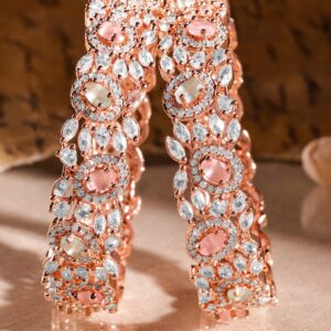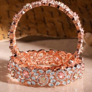 This set of 2 premium bangles features pastel pink, blue, and white cubic zirconia stones in an intricate floral design with 22K rose gold plating, perfect for wedding looks and festive elegance. Occasion : Bring your style to a whole new level with this handcrafted piece of jewellery. When you’re celebrating a special Occasion : – a birthday, wedding, or personal milestone – this piece adds that extra something that makes us feel special and looking our best. Material & Care Material: Brass Plating : Rose Gold Plated Net Weight: 50 Gram Net Quantity: 2 Bangles Care Label: It is advisable to avoid contact with water and organic chemicals i.e. perfume sprays. Store jewellery in airtight box. After use, wipe the jewellery with soft cotton cloth.