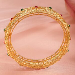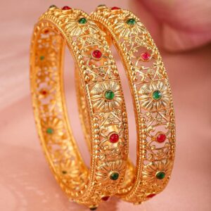 Bangle : This exquisite piece, ‘ Set Of 2 22k Gold-Plated Stone-Studded Bangles’, is a perfect blend of elegance and craftsmanship. Designed to captivate, it reflects timeless beauty and intricate detailing. Ideal for special occasions, this accessory adds a touch of sophistication to your look. Made with high-quality materials, it guarantees durability and comfort. Elevate your style with this stunning creation, making you stand out effortlessly. Occasion : Bring your style to a whole new level with this handcrafted piece of jewellery. When you’re celebrating a special Occasion : – a birthday, wedding, or personal milestone – this piece adds that extra something that makes us feel special and looking our best. Material : & Care Material: Brass Net Weight: 42 Gram Net Quantity: 2 Bangles Care Label : It is advisable to avoid contact with water and organic chemicals i.e. perfume sprays. Store jewellery in airtight box. After use, wipe the jewellery with soft cotton cloth.
