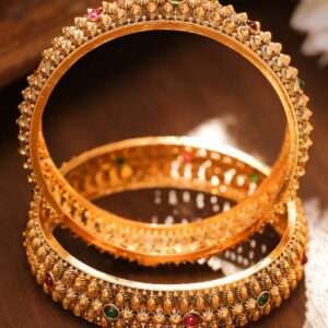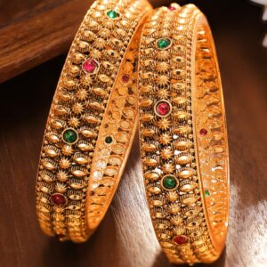 Bangle :These 24K gold-plated bangles from feature ruby red and emerald green stones set on a golden beaded traditional design. Crafted in brass, this set of 2 offers an elegant and festive look for women. Styling & Occasion: Perfect to pair with sarees or lehengas, these bangles are suited for festive events, traditional ceremonies, and wedding functions for women. Material : & Care Material: Brass Net Weight: 60.81 Gram Net Quantity: 2 Bangles Care Label : It is advisable to avoid contact with water and organic chemicals i.e. perfume sprays. Store jewellery in airtight box. After use, wipe the jewellery with soft cotton cloth.