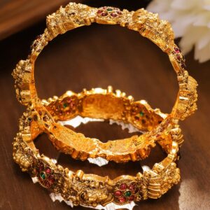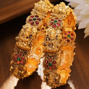 Bangles : This set of 2 24K gold-plated temple bangles features divine Lakshmi motifs, ruby red and green stone clusters, and intricate temple-style craftsmanship in a traditional antique finish. Perfect for Celebrations: Whether for wedding ceremonies, pujas, or traditional festivities, this statement pair adds unmatched grandeur and completes your authentic Indian look. Material : & Care Net Weight: 76.67 gram Net Quantity : 2 Bangles Material : Brass Plating : Gold Plated Care Label : It is advisable to avoid contact with water and organic chemicals i.e. perfume sprays. Store jewellery in airtight box. After use, wipe the jewellery with soft cotton cloth.