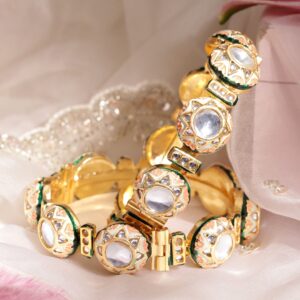 Adorn your wrist with finest handcrafted gold plated bangles studded with color stones. Pair it up and flaunt with your ethnic attire. Occasion : Bring your style to a whole new level with this handcrafted piece of jewelry. When you’re celebrating a special Occasion : – a birthday, wedding, or personal milestone – this piece adds that extra something that makes us feel special and looking our best. Material & Care Material : Brass Care Label : It is advisable to avoid contact with water and organic chemicals i.e. perfume sprays. Store jewelry in airtight box