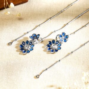 Product Details : This set of 2 oxidized silver-plated anklets features delicate floral charms studded with blue kundan stones, adding a traditional yet vibrant touch to your ethnic look. Designed for festive elegance for women & girls. Occasion : Bring your style to a whole new level with this handcrafted piece of jewellery. When you’re celebrating a special Occasion : – a birthday, wedding, or personal milestone – this piece adds that extra something that makes us feel special and looking our best. Material & Care Dimension : Length : 27 cm ; Width : 2 cm Material : Brass Net Weight: 12.55 Gram Net Quantity: 1 Pair Of Anklet Care Label: It is advisable to avoid contact with water and organic chemicals i.e. perfume sprays. Store jewellery in airtight box. After use, wipe the jewellery with soft cotton cloth.