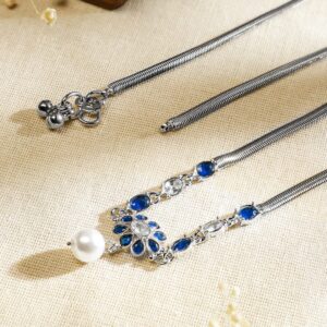 Product Details : Set of 2 oxidized silver-plated anklets featuring blue and white kundan accents, and a dangling pearl. Elegant and festive, crafted for women & girls to pair with ethnic wear. Occasion : Bring your style to a whole new level with this handcrafted piece of jewellery. When you’re celebrating a special Occasion : – a birthday, wedding, or personal milestone – this piece adds that extra something that makes us feel special and looking our best. Material & Care Dimension : Length : 27 cm ; Width : 3 cm Material : Brass Net Weight: 25.49 Gram Net Quantity: 1 Pair Of Anklet Care Label: It is advisable to avoid contact with water and organic chemicals i.e. perfume sprays. Store jewellery in airtight box. After use, wipe the jewellery with soft cotton cloth.
