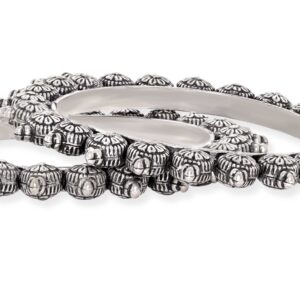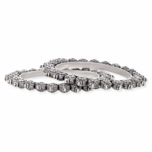 This set includes two exquisite bangle bracelets, each adorned with a delicately crafted lotus motif in oxidized silver plating. The lotus, symbolizing purity and enlightenment, adds a meaningful touch to these pieces. The oxidized finish imparts a sense of vintage charm, making them versatile accessories suitable for various occasions. Material & Care Material : Brass Care Label : It is advisable to avoid contact with water and organic chemicals i.e. perfume sprays. Store jewellery in airtight box. After use, wipe the jewellery with soft cotton cloth.