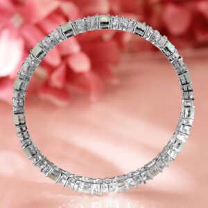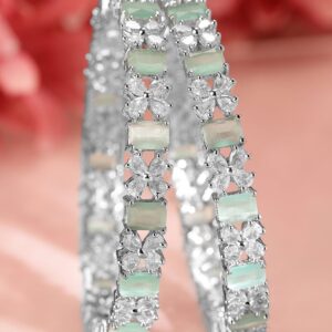 Set of 2 rhodium-plated bangles featuring elegant mint green stones and sparkling cubic zirconia, crafted in a floral-inspired design, perfect for elevating any outfit. Occasion : Bring your style to a whole new level with this handcrafted piece of jewellery. When you’re celebrating a special Occasion : – a birthday, festive, wedding, or personal milestone – this piece adds that extra something that makes us feel special and looking our best. Material & Care Material : Brass Weight : 43,46 Gram Net Qnty : 2 Bangles Care Label : It is advisable to avoid contact with water and organic chemicals i.e. perfume sprays. Store jewellery in airtight box. After use, wipe the jewellery with soft cotton cloth.