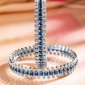 Bangle : This set of 2 rhodium-plated bangles showcases a striking combination of blue and white cubic zirconia stones, enhancing their luxurious appeal. The handcrafted design exudes elegance, making them the perfect accessory for festive and wedding looks. Occasion : Bring your style to a whole new level with this handcrafted piece of jewellery. When you’re celebrating a special Occasion : – a birthday, wedding, festive or personal milestone – this piece adds that extra something that makes us feel special and looking our best. Material & Carex`x Material: Brass Plating : Rhodium Plated Net Weight: 45.09 Gram Net Quantity: 2 Bangles Care Label : It is advisable to avoid contact with water and organic chemicals i.e. perfume sprays. Store jewellery in airtight box. After use, wipe the jewellery with soft cotton cloth.
