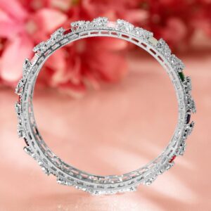Bangle : This exquisite piece, ‘ Set Of 2 Rhodium-Plated CZ Studded Bangles’, is a perfect blend of elegance and craftsmanship. Designed to captivate, it reflects timeless beauty and intricate detailing. Ideal for special occasions, this accessory adds a touch of sophistication to your look. Made with high-quality materials, it guarantees durability and comfort. Elevate your style with this stunning creation, making you stand out effortlessly. Occasion : Bring your style to a whole new level with this handcrafted piece of jewellery. When you’re celebrating a special Occasion : – a birthday, wedding, or personal milestone – this piece adds that extra something that makes us feel special and looking our best. Material : & Care Material: Brass Net Weight: 51.56 Gram Net Quantity: 2 Bangles Care Label : It is advisable to avoid contact with water and organic chemicals i.e. perfume sprays. Store jewellery in airtight box. After use, wipe the jewellery with soft cotton cloth.