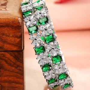 Bangle : These exquisite rhodium-plated bangles feature radiant emerald green stones complemented by brilliant cubic zirconia, designed to elevate your style with elegance and sparkle. Occasion : Bring your style to a whole new level with this handcrafted piece of jewellery. When you’re celebrating a special Occasion : – a birthday, wedding, festive or personal milestone – this piece adds that extra something that makes us feel special and looking our best. Material & Care Material: Brass Plating : Rhodium Plated Net Weight: 42.75 Gram Net Quantity: 2 Bangles Care Label : It is advisable to avoid contact with water and organic chemicals i.e. perfume sprays. Store jewellery in airtight box. After use, wipe the jewellery with soft cotton cloth.