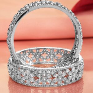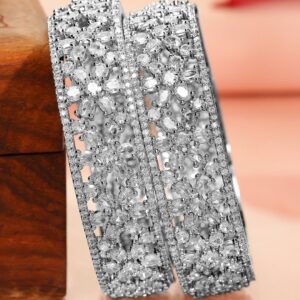 Bangles: This set of 2 premium rhodium-plated bangles is adorned with high-quality white AD and cubic zirconia stones, making it a dazzling addition to your jewelry collection, perfect for any look. Occasion : Bring your style to a whole new level with this handcrafted piece of jewellery. When you’re celebrating a special Occasion : – parties, wedding, festive or personal milestone – this piece adds that extra something that makes us feel special and looking our best. Material & Care Plating :Rhodium Plated Material : Brass Net Quantity : 2 Bangles Weight : 72.54 g Care Label : It is advisable to avoid contact with water and organic chemicals i.e. perfume sprays. Store jewellery in airtight box. After use, wipe the jewellery with soft cotton cloth.