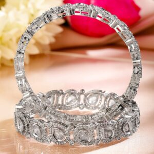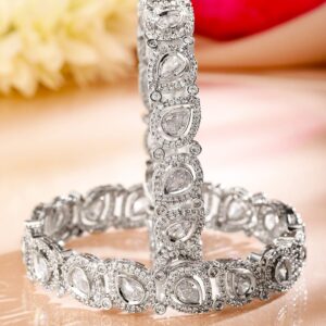 Bangle : These rhodium-plated handcrafted bangles feature teardrop-shaped cubic zirconia stones in an elegant setting, offering a luxurious appeal perfect for weddings, festivities & grand occasions. Occasion : Bring your style to a whole new level with this handcrafted piece of jewellery. When you’re celebrating a special Occasion : – a birthday, wedding, festive or personal milestone – this piece adds that extra something that makes us feel special and looking our best. Material & Care Material: Brass Plating : Rhodium Plated Net Weight: 80 Gram Net Quantity: 2 Bangles Care Label : It is advisable to avoid contact with water and organic chemicals i.e. perfume sprays. Store jewellery in airtight box. After use, wipe the jewellery with soft cotton cloth.