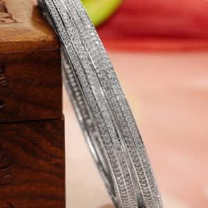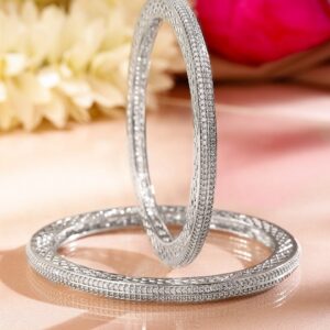 Bangle : A premium set of 2 rhodium-plated bangles, elegantly studded with white cubic zirconia for a diamond-like brilliance. Their sleek silver-tone finish adds a touch of timeless luxury to any ensemble. Occasion : Bring your style to a whole new level with this handcrafted piece of jewellery. When you’re celebrating a special Occasion : – a birthday, wedding, festive or personal milestone – this piece adds that extra something that makes us feel special and looking our best. Material & Care Material: Brass Plating : Rhodium Plated Net Weight: 48.15 Gram Net Quantity: 2 Bangles Care Label : It is advisable to avoid contact with water and organic chemicals i.e. perfume sprays. Store jewellery in airtight box. After use, wipe the jewellery with soft cotton cloth.