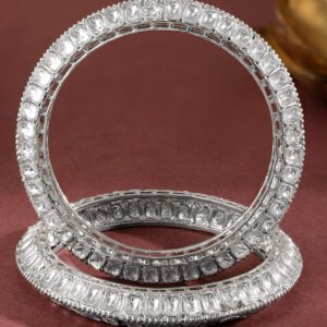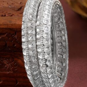 Bangles : Set of 2 broad bangles crafted in silver plating, fully studded with white kundan stones. Designed for bridal elegance, festive charm, and luxurious traditional wear. Perfect for Grand Occasions: Ideal for bridal wear, traditional weddings, and festive functions—these bangles pair beautifully with lehengas, sarees, and ethnic suits to complete a royal look. Material : & Care Material : Brass Weight : 60 Gram Net Qnty : 2 Bangles Care Label : It is advisable to avoid contact with water and organic chemicals i.e. perfume sprays. Store jewellery in airtight box. After use, wipe the jewellery with soft cotton cloth.