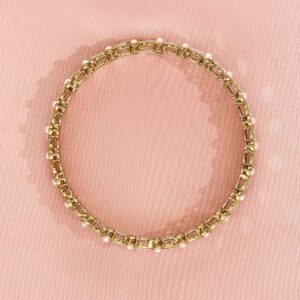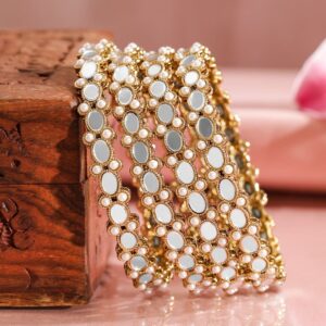 Elegant set of 4 bangles, 22K gold-plated, adorned with mirror studs and delicate pearl beads. These bangles bring a refined and radiant touch to any traditional attire. Material & Care Dimension : 2.4: 2.6 : 2.8 sizes Material: Brass Net Weight: 71.09 Gram Net Quantity: 4 Bangles Care Label: It is advisable to avoid contact with water and organic chemicals i.e. perfume sprays. Store jewellery in airtight box. After use, wipe the jewellery with soft cotton cloth.