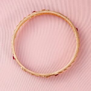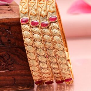 Bangle : This set of 4 bangles is crafted with intricate filigree work and 22K gold plating. Each bangle is adorned with ruby pink stones, offering a rich traditional look that’s perfect for enhancing ethnic attire. Occasion : Bring your style to a whole new level with this handcrafted piece of jewellery. When you’re celebrating a special Occasion : – a birthday, wedding, or personal milestone – this piece adds that extra something that makes us feel special and looking our best. Material : & Care Dimension : Net Weight: 68,21 g Net Quantity: 4 Bangles Material :Brass Care Label : It is advisable to avoid contact with water and organic chemicals i.e. perfume sprays. Store jewellery in airtight box. After use, wipe the jewellery with soft cotton cloth.