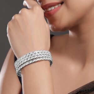 Bangle : Discover the elegance of Set Of 4 Rhodium-Plated Crystal AD & Cubic Zirconia Studded Bangles. This piece combines quality craftsmanship with a timeless design, making it perfect for any occasion. Elevate your style effortlessly and enjoy compliments on your refined taste. A must-have addition to your jewelry collection. Occasion : Bring your style to a whole new level with this handcrafted piece of jewellery. When you’re celebrating a special Occasion : – a birthday, wedding, or personal milestone – this piece adds that extra something that makes us feel special and looking our best. Material : & Care Material: Brass Net Weight: 73.5 Gram Net Quantity: 4 Bangles Plating : Rhodium Plated Care Label: It is advisable to avoid contact with water and organic chemicals i.e. perfume sprays. Store jewellery in airtight box. After use, wipe the jewellery with soft cotton cloth.