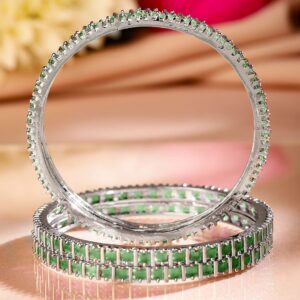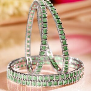 Bangles & Bracelet : A stunning set of 4 rhodium-plated bangles, adorned with square-cut emerald green cubic zirconia stones for a modern yet timeless appeal. The sleek and sophisticated design makes these handcrafted bangles a versatile addition to both traditional and contemporary looks. Occasion : Bring your style to a whole new level with this handcrafted piece of jewellery. When you’re celebrating a special Occasion : – a birthday, wedding, or personal milestone – this piece adds that extra something that makes us feel special and looking our best. Material : & Care Net Quantity : 4 Bangles Net Weight: 60.71 g Material :Brass Care Label : It is advisable to avoid contact with water and organic chemicals i.e. perfume sprays. Store jewellery in airtight box. After use, wipe the jewellery with soft cotton cloth.