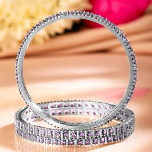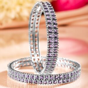 This set of 4 rhodium-plated bangles features stunning lavender cubic zirconia stones in a meticulously handcrafted design. The premium finish and radiant sparkle make them an exquisite addition to festive and wedding ensembles Occasion : Bring your style to a whole new level with this handcrafted piece of jewellery. When you’re celebrating a special Occasion : – a birthday, wedding, or personal milestone – this piece adds that extra something that makes us feel special and looking our best. Material : & Care Material: Brass Net Weight: 58.38 g Net Quantity: 4 Bangles Care Label : It is advisable to avoid contact with water and organic chemicals i.e. perfume sprays. Store jewellery in airtight box. After use, wipe the jewellery with soft cotton cloth.