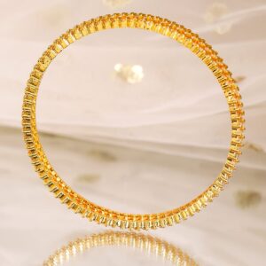 Set of 6 handcrafted 22K gold-plated bangles, adorned with cubic zirconia stones in an elegant, textured pattern. A perfect blend of traditional craftsmanship and modern style for a graceful look. Material: Brass Plating : Gold Plated Net Weight: 38.69 Gram Net Quantity: 6 Bangles Care Label: It is advisable to avoid contact with water and organic chemicals i.e. perfume sprays. Store jewellery in airtight box. After use, wipe the jewellery with soft cotton cloth.