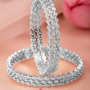 Bangle : This set of 6 rhodium-plated bangles in a radiant silver tone features bezel-set cubic zirconia stones in a timeless design—perfect for weddings, parties, and everyday glam. Occasion : Bring your style to a whole new level with this handcrafted piece of jewellery. When you’re celebrating a special Occasion : – a birthday, wedding, festive or personal milestone – this piece adds that extra something that makes us feel special and looking our best. Material & Care Material: Brass Plating : Rhodium Plated Net Weight: 50.77 Gram Net Quantity: 6 Bangles Care Label : It is advisable to avoid contact with water and organic chemicals i.e. perfume sprays. Store jewellery in airtight box. After use, wipe the jewellery with soft cotton cloth.