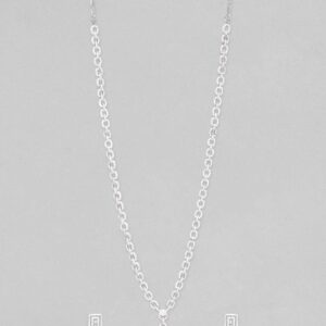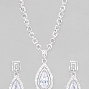 It’s a jewellery set fit for the queens! Exude the royal vibe with this stone studded jewellery set. Consisting of a necklace, matching earrings, this necklace set is crafted from silver-plated brass and stones . Occasion : Bring your style to a whole new level with this handcrafted piece of jewellery. When you’re celebrating a special Occasion : – a birthday, wedding, or personal milestone – this piece adds that extra something that makes us feel special and looking our best. Material : & Care Dimension : Necklace 56 cm; Earrings 5 cm Material : Brass Collection : AD(Silver) Net Weight: 64.41 Gram Net Quantity: 1 Necklace & 1 Pair of Earrings Care Label: It is advisable to avoid contact with water and organic chemicals i.e. perfume sprays. Store jewellery in airtight box. After use, wipe the jewellery with soft cotton cloth.