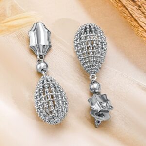 Earrings : Elegant silver-plated drop earrings featuring intricate beaded detailing and a modern design. Perfect for both casual and formal looks, adding timeless charm. Occasion : Bring your style to a whole new level with this handcrafted piece of jewellery. When you’re celebrating a special Occasion : – a birthday, parties or personal milestone – this piece adds that extra something that makes us feel special and looking our best. Material & Care Dimension : Length : 5.7 cm, Width: 1.5 cm Net Weight: 26.06 g Net Quantity : 1 Pair Of Earrings Material : Brass Care Label : It is advisable to avoid contact with water and organic chemicals i.e. perfume sprays. Store jewellery in airtight box. After use, wipe the jewellery with soft cotton cloth.