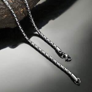 Necklace and Chains : This silver-plated box chain necklace features a structured, geometric design, giving it a modern, edgy appeal. Crafted for durability and everyday wear, it’s a versatile accessory for men. Occasion : Bring your style to a whole new level with this handcrafted piece of jewellery. When you’re celebrating a special Occasion : – a birthday, wedding, or personal milestone – this piece adds that extra something that makes us feel special and looking our best. Material : & Care Dimension : Size : Length : 25 cm, Width : 1 cm Net Quantity : 1 Necklace and Chains Net Weight: 20.85 g Material :Brass Care Label : It is advisable to avoid contact with water and organic chemicals i.e. perfume sprays. Store jewellery in airtight box. After use, wipe the jewellery with soft cotton cloth.