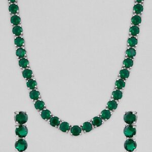 It’s a jewellery set fit for the queens! Exude the royal vibe with this stone studded jewellery set. Consisting of a necklace, matching earrings, this necklace set is crafted from silver-plated copper, stones and beads. Occasion : ¬† Bring your style to a whole new level with this handcrafted piece of jewellery. When you’re celebrating a special Occasion : – a birthday, wedding, or personal milestone – this piece adds that extra something that makes us feel special and looking our best. Material & Care Dimension : Necklace 43 cm; Earrings 2.4 cm Material : Brass Collection : AD(Silver) Net Quantity: 1 Necklace & 1 Pair of Earrings Care Label : It is advisable to avoid contact with water and organic chemicals i.e. perfume sprays. Store jewellery in airtight box. After use, wipe the jewellery with soft cotton cloth