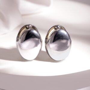 Stud Earrings :Add a touch of elegance with silver-plated oval clip-on earrings. Featuring a smooth, polished finish, these minimalistic earrings are perfect for effortless and timeless style. Occasion : Bring your style to a whole new level with this handcrafted piece of jewellery. When you’re celebrating a special Occasion : – a birthday, wedding, or personal milestone – this piece adds that extra something that makes us feel special and looking our best. Material : & Care Dimension : Length : 2.5 cm, Width : 1.5 cm Material : Brass Weight : 6g Net qnty : 1 Pair of Earrings Care Label : It is advisable to avoid contact with water and organic chemicals i.e. perfume sprays. Store jewellery in airtight box. After use, wipe the jewellery with soft cotton cloth.