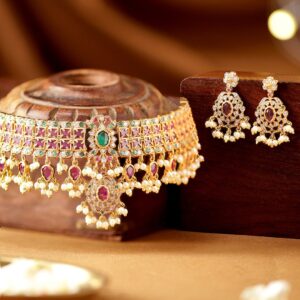 Luxury 24K Gold Plated Handcrafted Ruby stone & Gold Pearls Studded Choker Set – Multicolor
