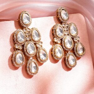 22K Gold-Plated White Oval Stone & Cubic Zirconia Studded Chandelier Earrings for Women – Premium Designer Jewelry