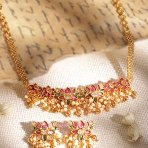 24K Gold Plated Ruby, Emerald & White Cubic Zirconia Stone Studded Handcrafted Floral Choker Jewelry Set – Pastel Pink