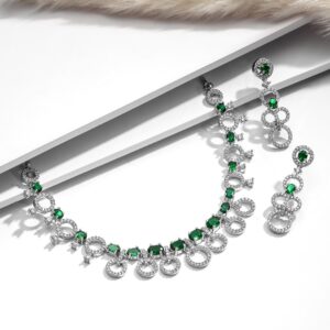 Rhodium Plated Emerald & Cubic Zirconia Studded Circular Link Jewellery Set – silver