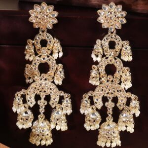 18K Gold Plated Kundan Work and Off-White Pearl Beaded Handcrafted Big Chandelier – Gold