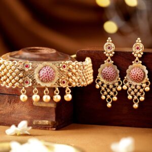 24K Gold Plated Handcrafted Ruby Stone Studded & Gold Beaded Traditional Choker Set – Gold
