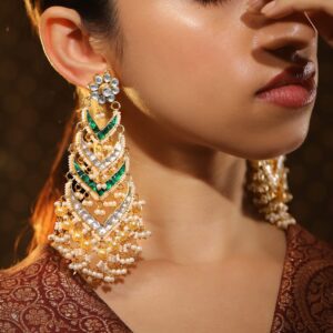 24K Gold-Plated White Kundan & Emerald Green Beaded Shoulder Duster Earrings – Multicolor