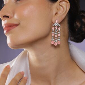 Rhodium-Plated Blush Pink & White Cubic Zirconia Studded Cascading Chandelier Earrings