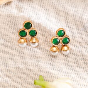 22KT Gold-Plated Emerald Green & Cubic Zirconia Studded Chandelie with Pearl Drops – Pastel Pink