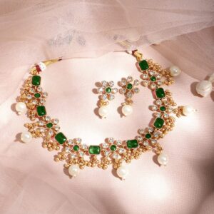 Rhodium-Plated Emerald Green & Cubic Zirconia Studded Floral Necklace Set