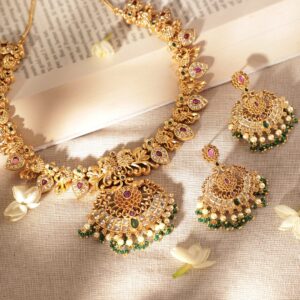 24K Gold Plated Ruby, Emerald & Cubic Zirconia Studded Temple Necklace Set with Pearl Beaded – Gold
