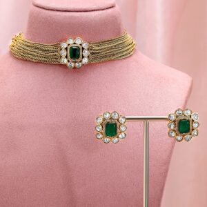 24K Gold-Plated Emerald Green & Kundan Studded Choker Set with Floral Stud Earrings – Green