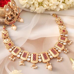 24K Gold-Plated Ruby, Kundan Studded & Pearl Drops Rectangle Motif Necklace Set – Gold