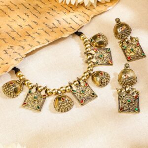 Oxidised Antique Gold-Plated Tribal Necklace Set with Dome Accents & Red-Green Stones for Women