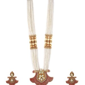 18K Gold-Plated Multilayered Kundan & Pearl Beaded Long Earrings with Peach Pink Beads – Gold