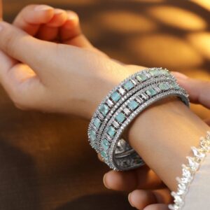 Set of 2 Silver-Plated Mint Green & White Cubic Zirconia Studded Premium Bangles – 02-Aug