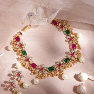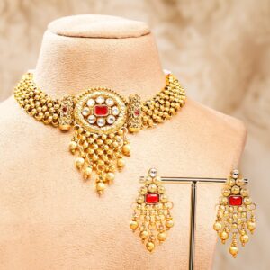 22K Gold Plated Ruby Red & White Kundan Studded Choker Jewellery Set with Golden Beads – Red
