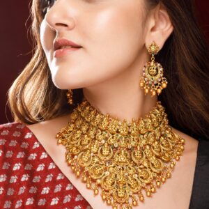 24K Gold-Plated Ruby & Emerald Studded Traditional Bridal Temple Necklace with Lakshmi Motif – Gold