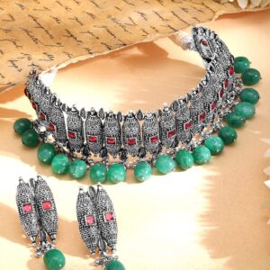 Oxidised Silver-Plated Green Beaded & Pink Stone Studded Choker Set – Pink & Green